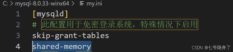 2. 在my.ini中增加skip-grant-tables 參數(shù),如果啟動服務(wù)后服務(wù)又立即停止,則需要增加shared-memory 參數(shù) ,此步驟主要是為了免密登錄mysql(PS 此步驟可以直接 在cmd中直接輸入:mysqld --console --skip-grant-tables --shared-memory)