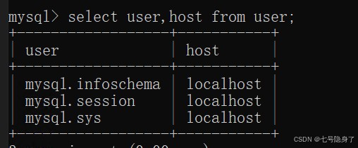 5. 進(jìn)入mysql后,使用select user,host from user;語句查詢用戶表中有哪些用戶,正常情況下user表中應(yīng)包含以下用戶信息: