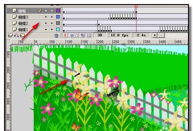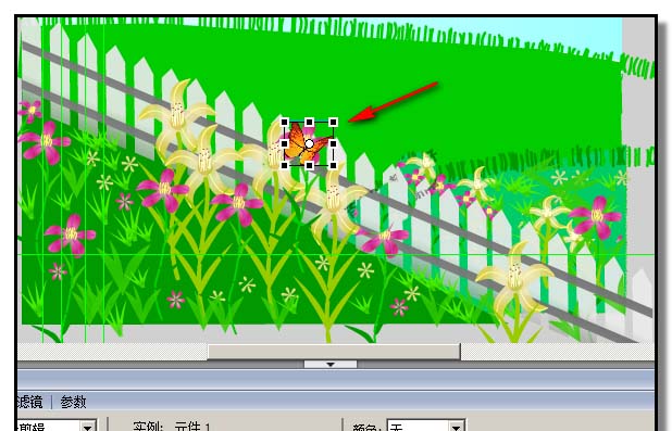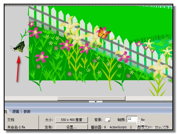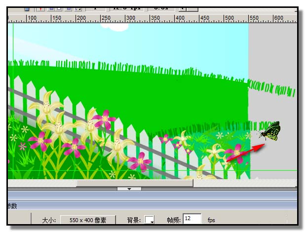 8、新建圖層,命名為蝴蝶2;把蝴蝶2的圖片導(dǎo)入到庫;然后,新建影片剪輯元件,按步驟5操作,制作蝴蝶2的元件;接著,把蝴蝶2插入到場景舞臺的右側(cè)這里,準(zhǔn)備飛入花園。在蝴蝶2圖層的第15幀處插入關(guān)鍵幀;把蝴蝶2移到花朵上。
