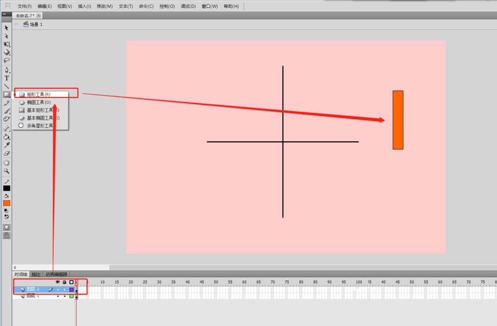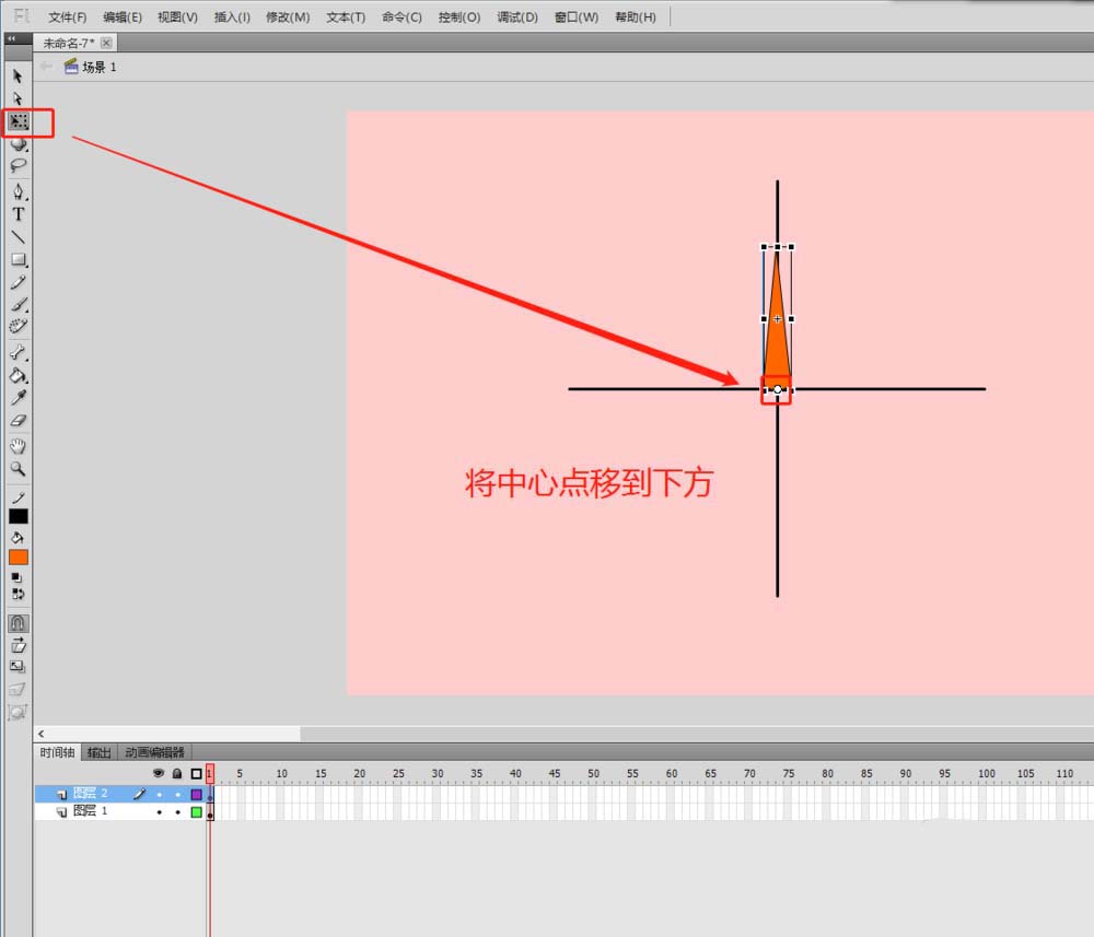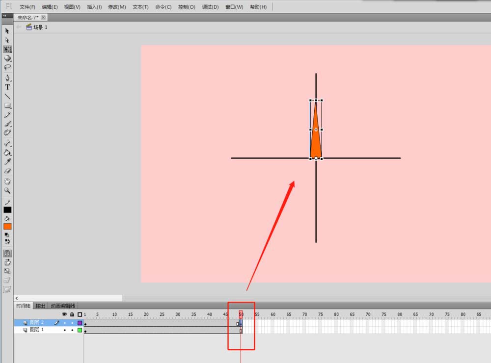 6、移動(dòng)箭頭到十字中心位置,并選擇任意變形工具將箭頭變換的中心點(diǎn)移到下方;然后在圖層2即箭頭的第50幀插入關(guān)鍵幀;圖層1鍵十字線條的第50幀插入普通幀。