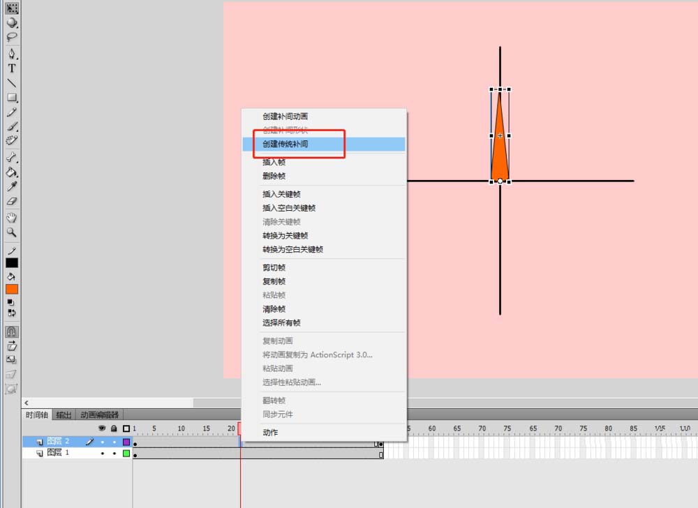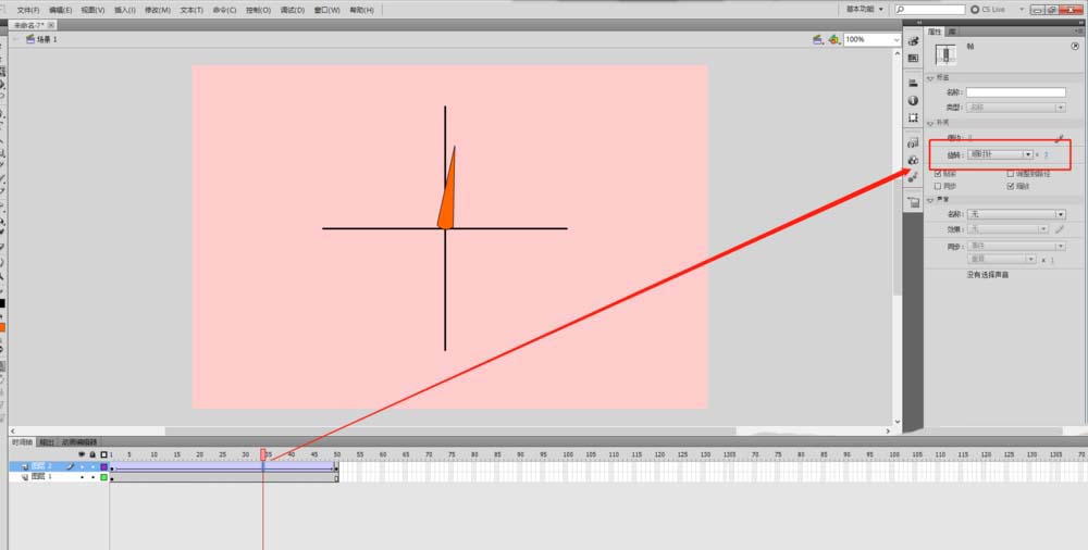 7、在圖層2箭頭圖層的第1到50關(guān)鍵幀之間任意一幀右鍵鼠標(biāo)創(chuàng)建傳統(tǒng)補(bǔ)間動(dòng)畫(huà),然后在幀屬性中選擇順時(shí)針旋轉(zhuǎn),并設(shè)置旋轉(zhuǎn)的數(shù)量,播放時(shí)間軸就可以看到箭頭旋轉(zhuǎn)動(dòng)畫(huà)。