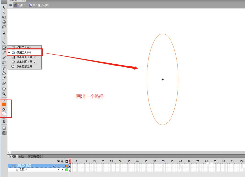 4、添加了引導(dǎo)層之后,時(shí)間軸圖層會(huì)出現(xiàn)兩個(gè)圖層,選擇引導(dǎo)層,用橢圓工具繪制出一個(gè)橢圓線出來(lái)。