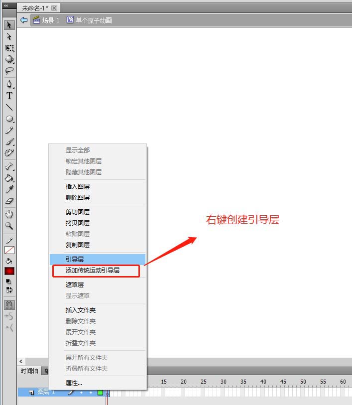 3、進(jìn)入影片剪輯內(nèi)部,選擇圖層1右鍵鼠標(biāo),選擇“添加傳統(tǒng)運(yùn)動(dòng)引導(dǎo)層”。