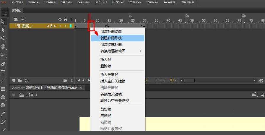 5、在1-15,15-30幀之間創(chuàng)建補(bǔ)間形狀動(dòng)畫(huà)