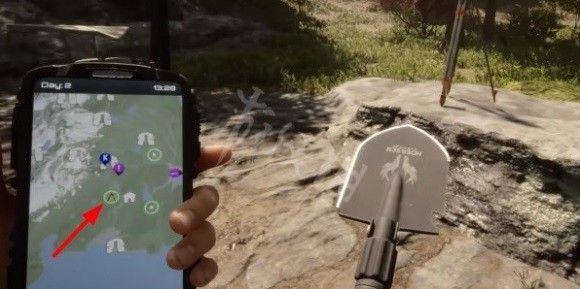 1、首先我們需要先獲得鏟子,然后來到下圖所在在的位置進(jìn)行挖掘。