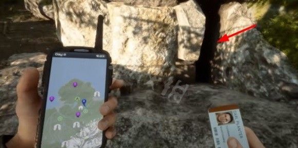 1、當(dāng)我們獲得第一張門禁卡以后,前往下圖位置,然后進(jìn)入箭頭標(biāo)記的山洞內(nèi)。