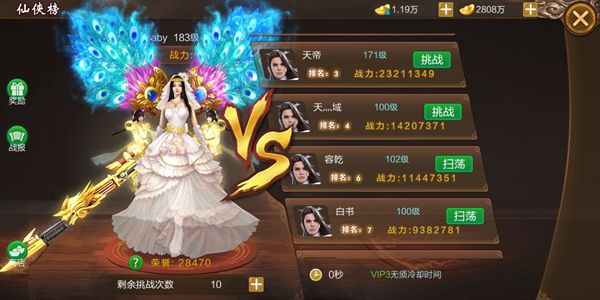 玩家在仙俠榜內(nèi)通過(guò)1V1方式戰(zhàn)勝對(duì)手提高排名.玩家每天擁有一定數(shù)量的挑戰(zhàn)次數(shù),每次挑戰(zhàn)后會(huì)累積冷卻時(shí)間,當(dāng)冷卻時(shí)間積累到一定程度則需要等待冷卻時(shí)間清空再進(jìn)行挑戰(zhàn),VIP6以上玩家每天還可以購(gòu)買更多的次數(shù)來(lái)繼續(xù)挑戰(zhàn)。