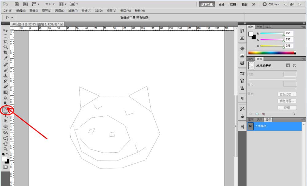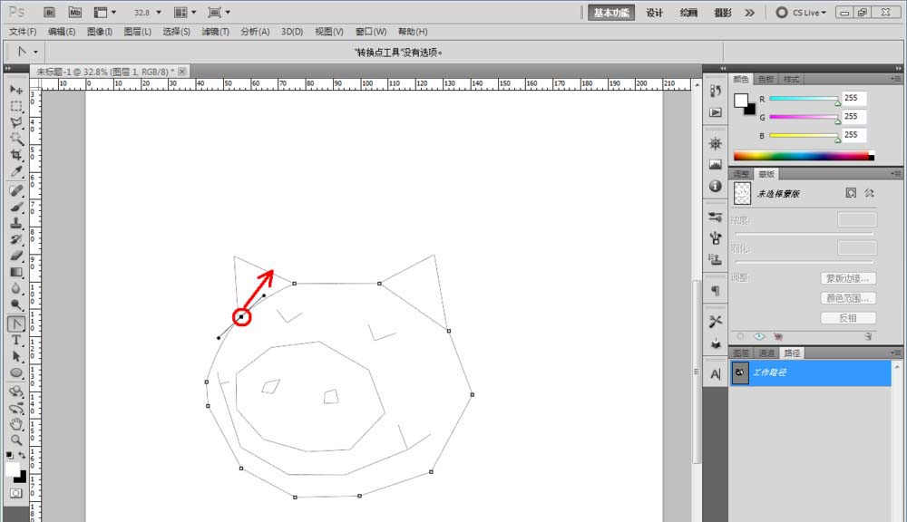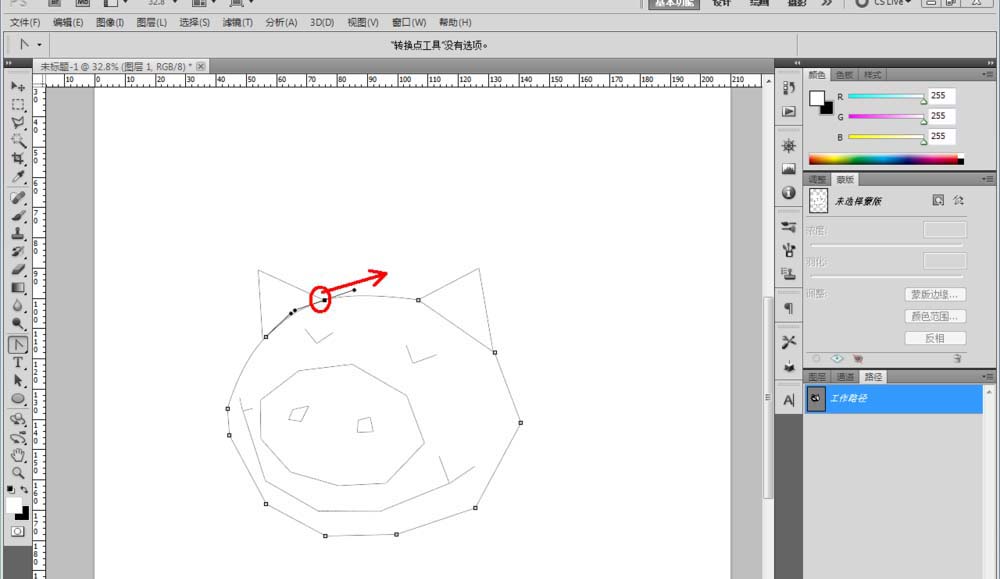 3、點擊【轉(zhuǎn)換工具】,鼠標(biāo)點擊拉動節(jié)點,將圖案上的節(jié)點曲線化,完成圖案的節(jié)點平滑處理,完成卡通豬頭部的繪制(如圖所示);