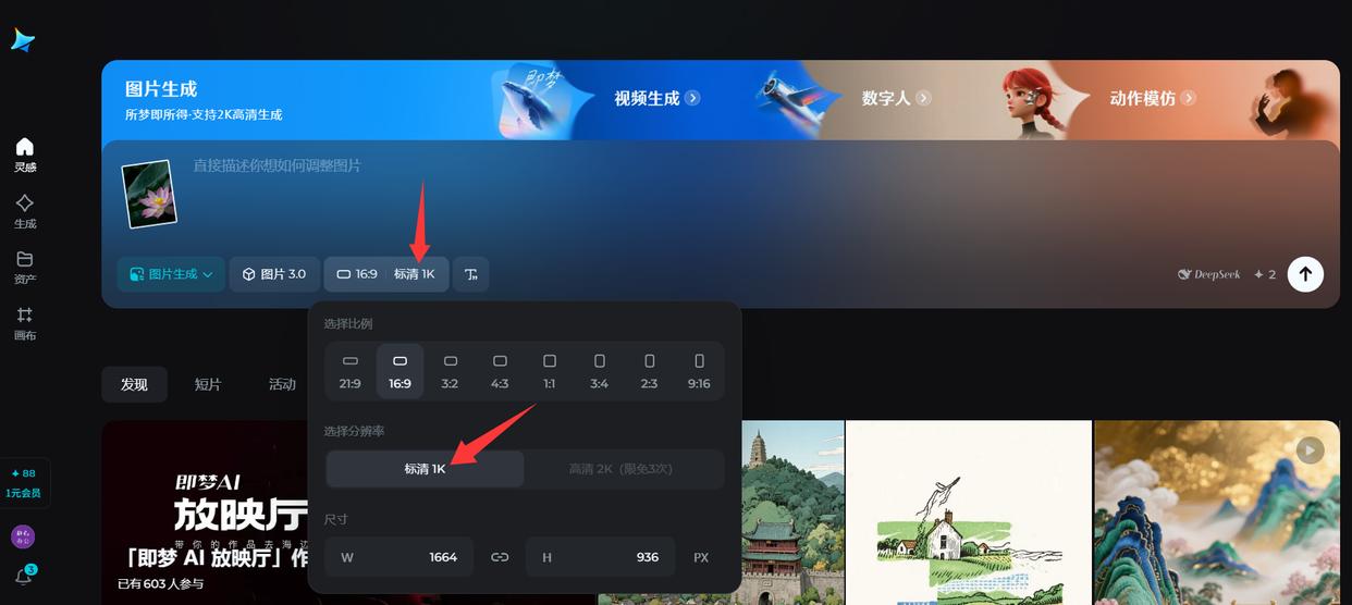 點(diǎn)擊【生圖比例】,根據(jù)需要選擇合適的圖片比例,這里選擇【16:9】。