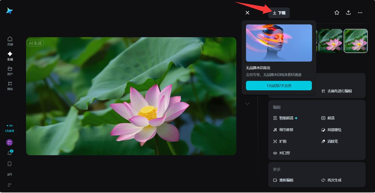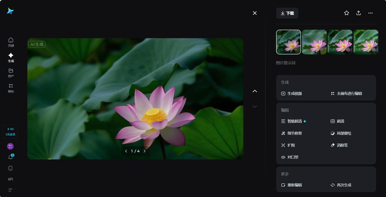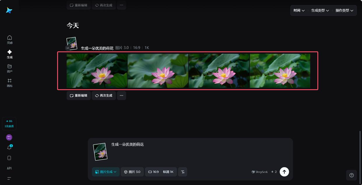 在對(duì)話框中輸入【提示詞】,再點(diǎn)擊右下角的生成按鈕,等待片刻,即夢(mèng)AI就幫我們生成好了4張荷花圖片。