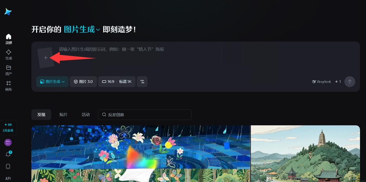 在打開(kāi)的頁(yè)面中,點(diǎn)擊對(duì)話框中的【+】,上傳我們要改造的圖片。