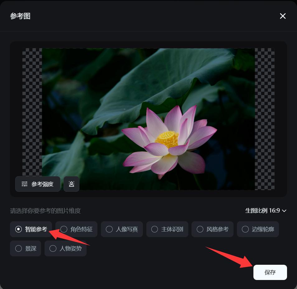 選擇想要參考的圖片維度,這里選擇【智能參考】,點(diǎn)擊【保存】按鈕。
