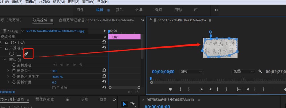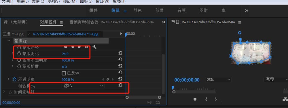 2、在效果控件中找到不透明度中的鋼筆工具,在照片中畫蒙版并調(diào)節(jié)蒙版羽化,接著將不透明度中的混合模式修改為“濾色”