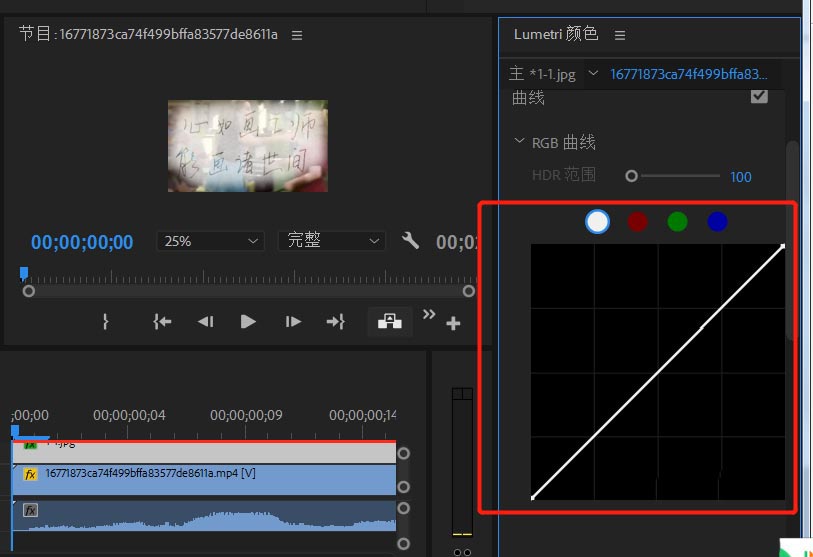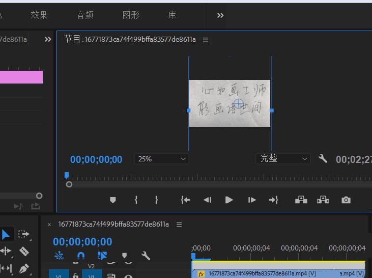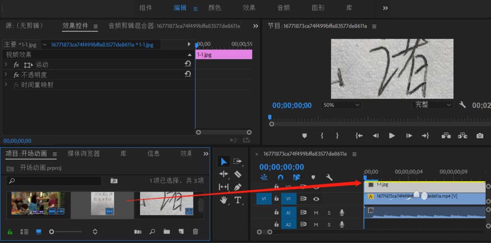 1、打開premiere將視頻素材和手寫照片導(dǎo)入到時間軌道中,將手寫照片放置到視頻上一層,并調(diào)節(jié)照片大小