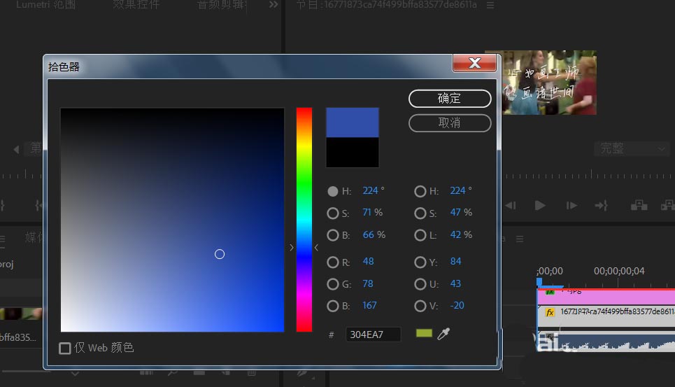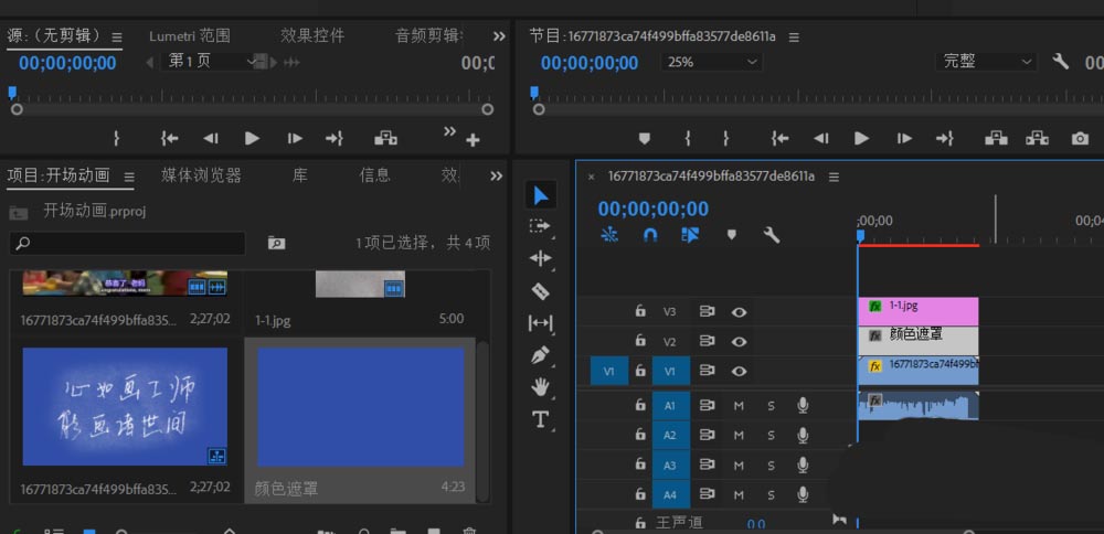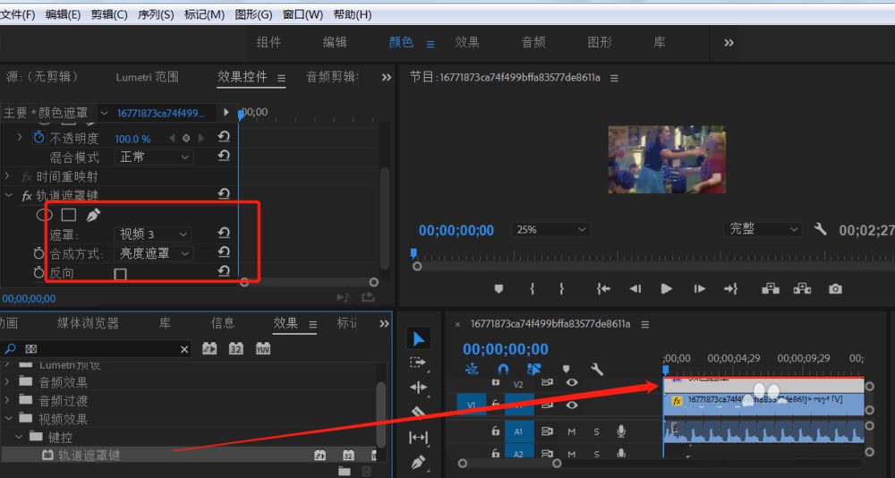 5、將顏色遮罩推至手寫文字下一層,并將“軌道遮罩鍵”應(yīng)用到顏色遮罩中,在效果控件中選擇遮罩為“視頻3”合成方式為“亮度遮罩”