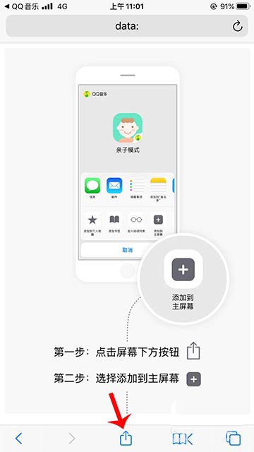 7.再點(diǎn)擊屏幕下方的箭頭按鈕,打開后選擇“添加到主屏幕”,QQ音樂親子模式就添加到桌面了。