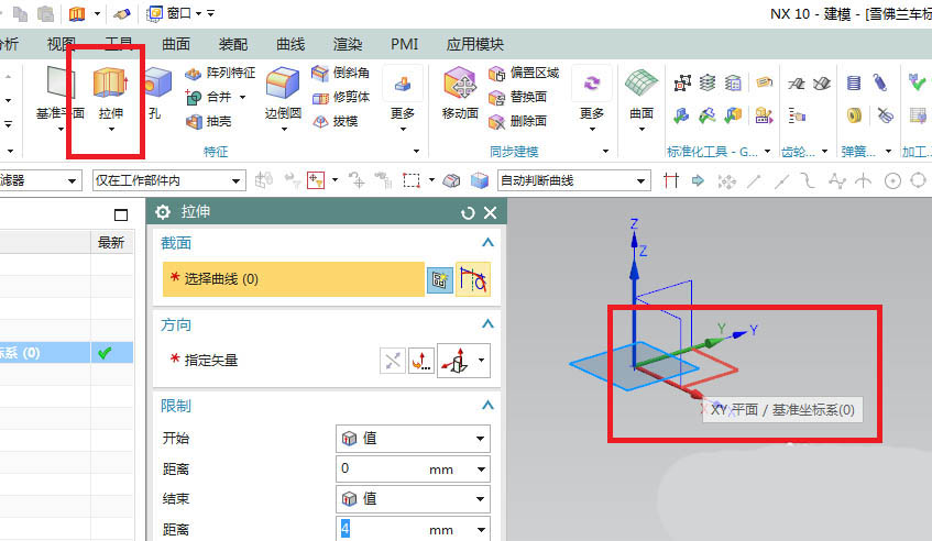 2、如下圖所示,點(diǎn)擊工具欄中的拉伸圖標(biāo),點(diǎn)擊基準(zhǔn)坐標(biāo)系中的XY平面。