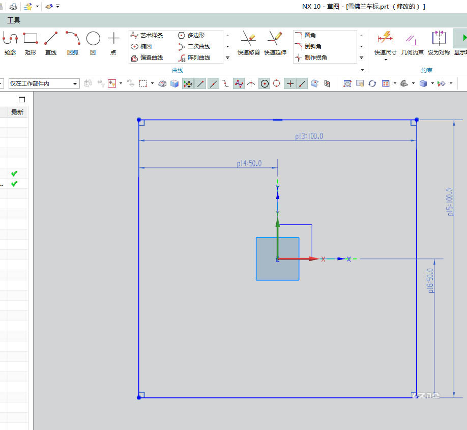 3、如下圖所示,進(jìn)入草圖,激活矩形命令,畫一個(gè)矩形,雙擊修改矩形尺寸:100x100、50、50