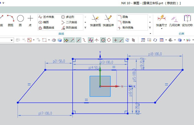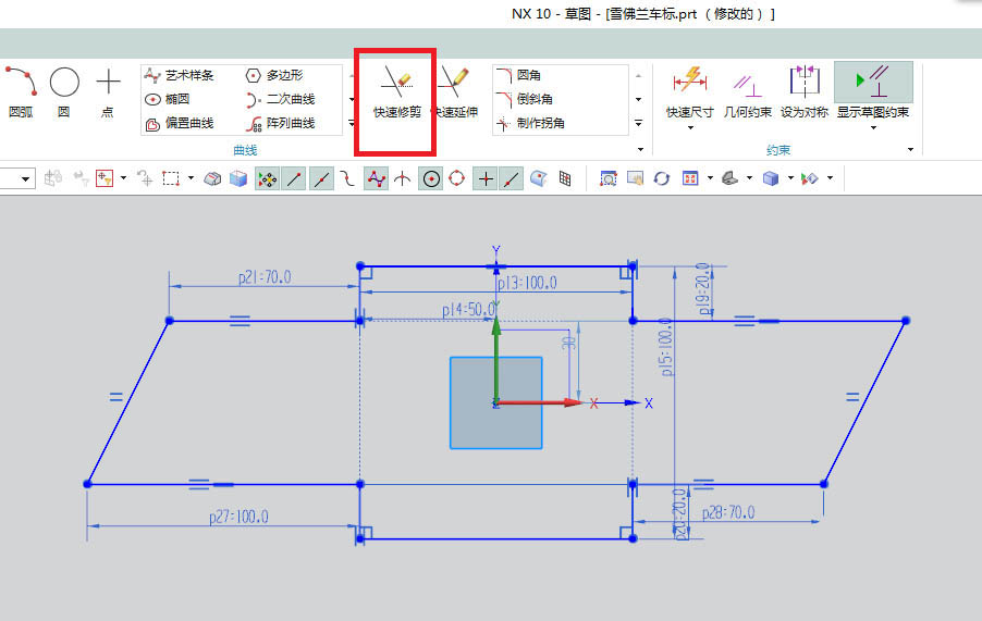 5、如下圖所示,再修改一下尺寸,確定一下形狀,然后激活快速修剪命令,將重合的部分線段修剪掉,點(diǎn)擊完成,退出草圖。