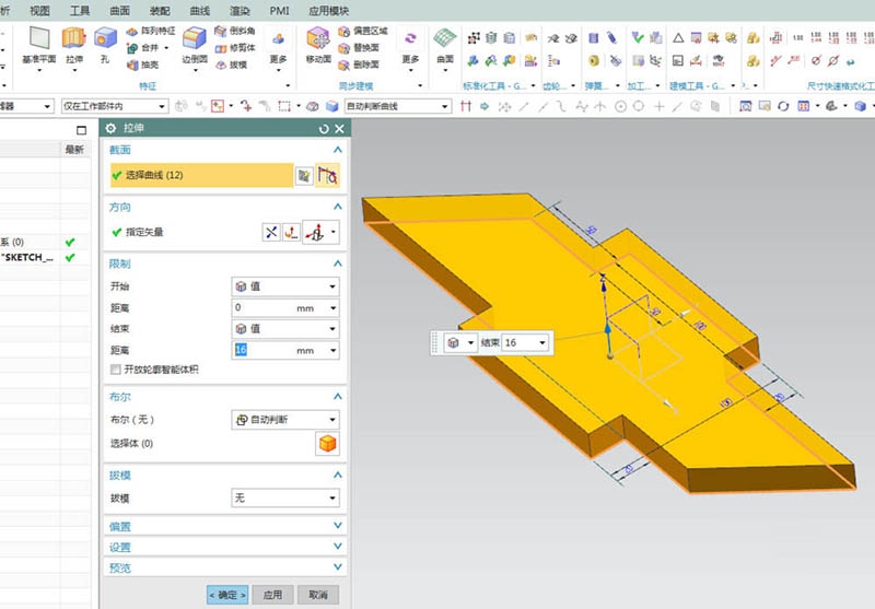 6、如下圖所示,回到拉伸對(duì)話框,設(shè)置距離:從0開始,16結(jié)束,點(diǎn)擊確定。