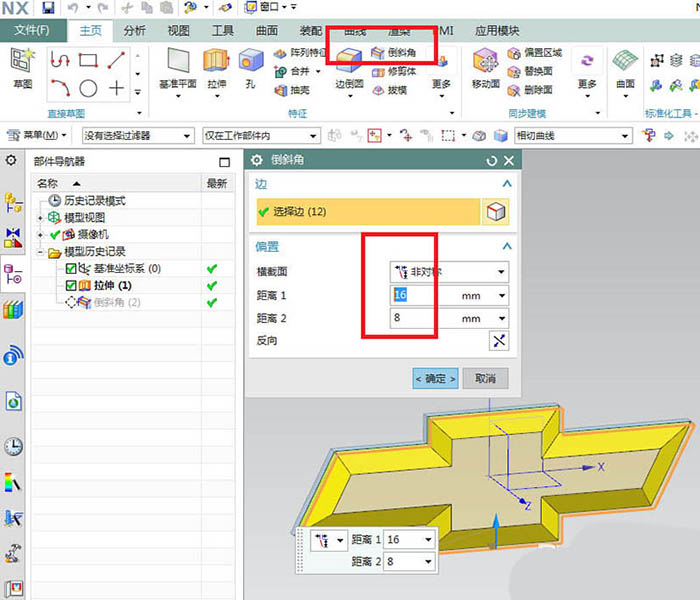 7、如下圖所示,點(diǎn)擊工具欄中的倒斜角命令,然后點(diǎn)擊實(shí)體中的邊線,設(shè)置偏置橫截面為“非對(duì)稱”,距離1為16,距離2為8,點(diǎn)擊確定