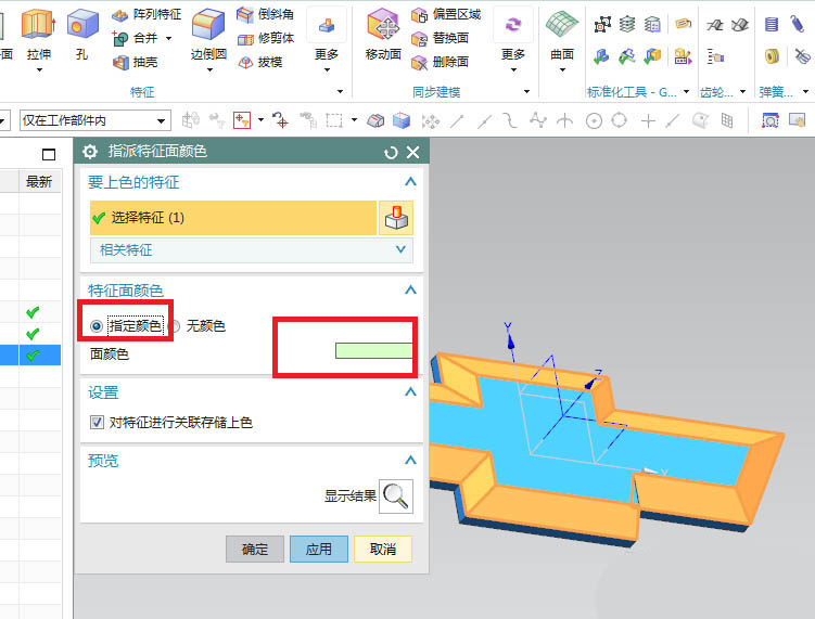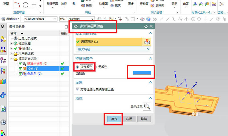 8、如下圖所示,選中拉伸特征,指定特征顏色,選定顏色,點(diǎn)擊確定。