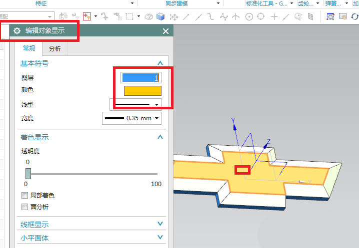 10、如下圖所示,選中實(shí)體的上平面,點(diǎn)擊“編輯對(duì)象顯示”,指定顏色為黃色,點(diǎn)擊確定。