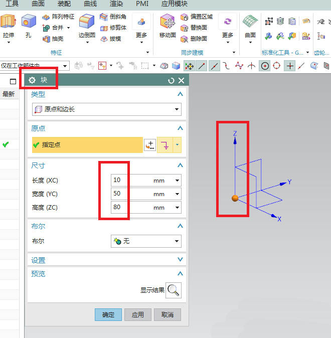 2、如下圖所示,執(zhí)行【菜單——插入——設(shè)計特征——長方體】,對話框中設(shè)置尺寸:10x50x80,點擊確定。