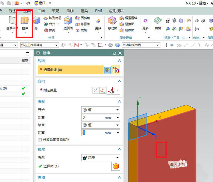 3、如下圖所示,點擊工具欄中的拉伸圖標(biāo),點擊實體中的紅色平面。