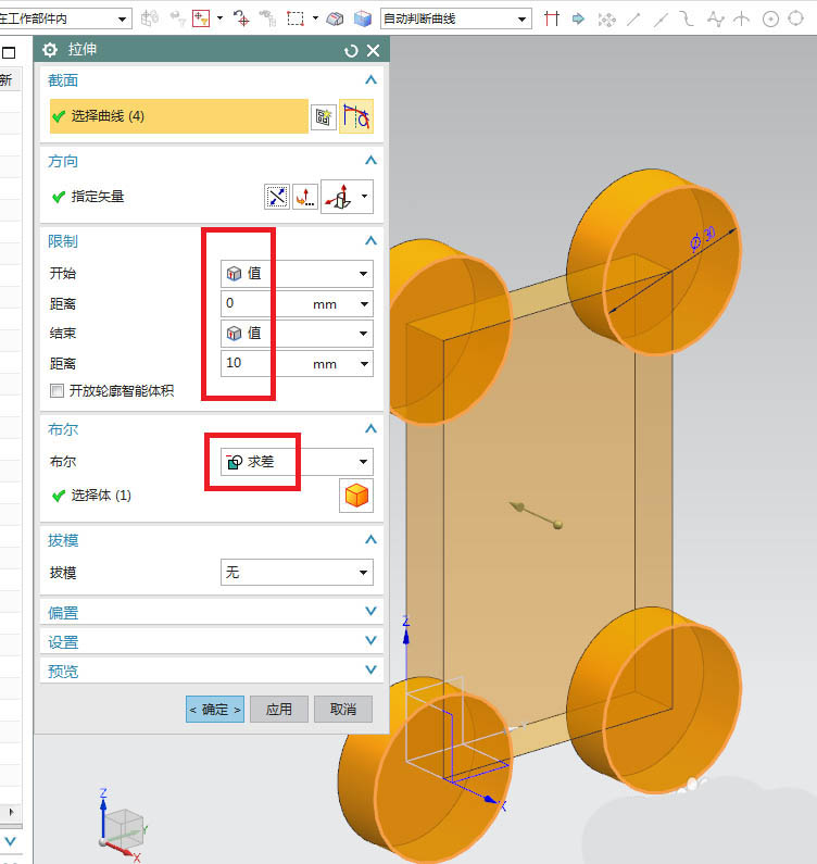 5、如下圖所示,回到拉伸對話框,設(shè)置限制為:從0開始,10結(jié)束,布爾求差,點擊確定。