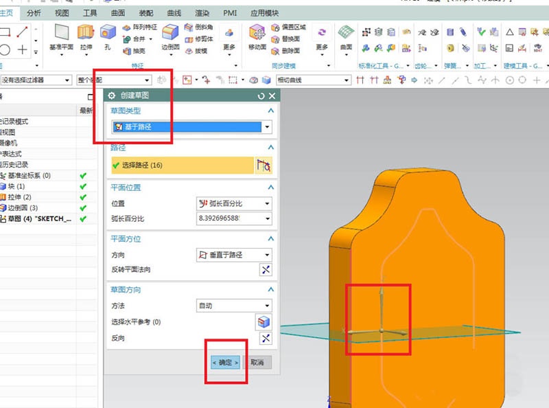 8、如下圖所示,點擊工具欄中的“草圖”圖標(biāo),對話框中將草圖類型改成“基于路徑”,點擊草圖,點擊確定,進入草圖。