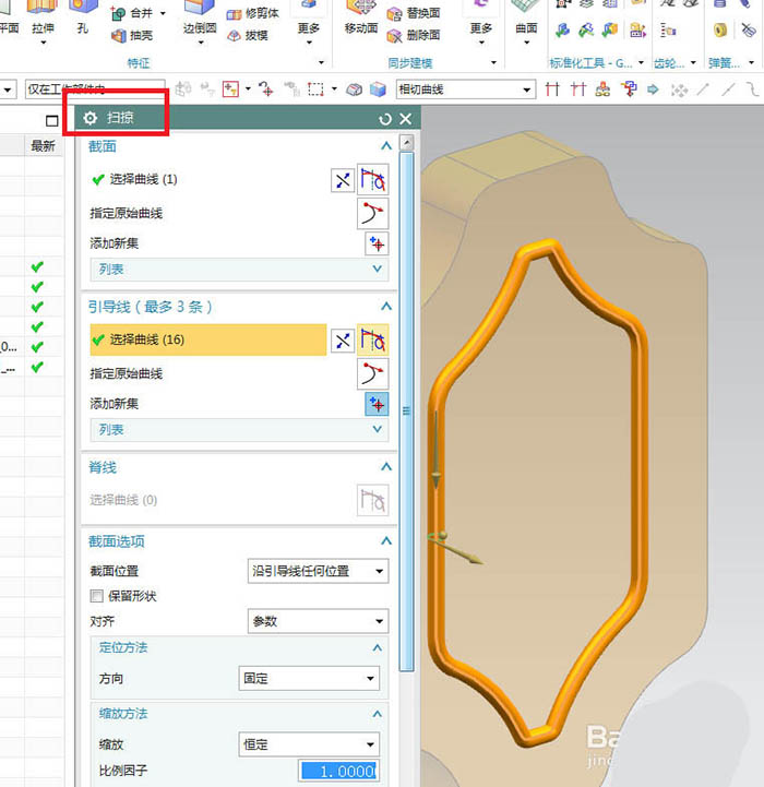 10、如下圖所示,執(zhí)行【菜單——插入——掃掠——掃掠】,截面選擇圓草圖,引導(dǎo)線選擇之前偏置生成的草圖,點擊確定。