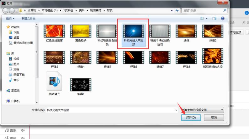 在打開(kāi)的窗口中,點(diǎn)擊選中需要的視頻,點(diǎn)擊打開(kāi)