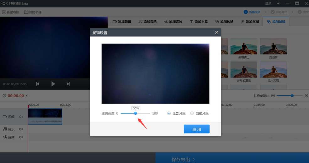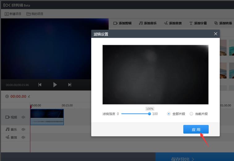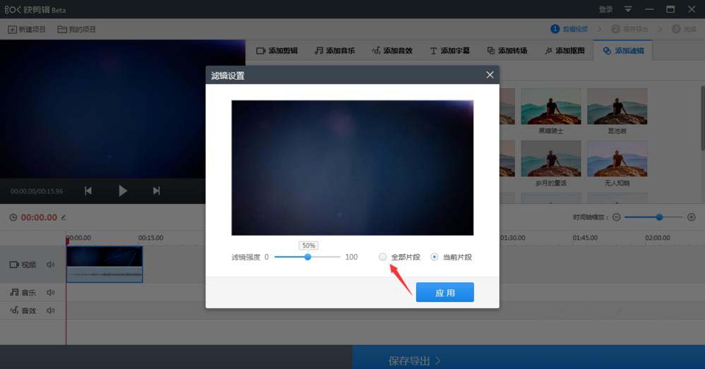 進(jìn)入濾鏡設(shè)置窗口,可以選擇將濾鏡應(yīng)用于全部片段