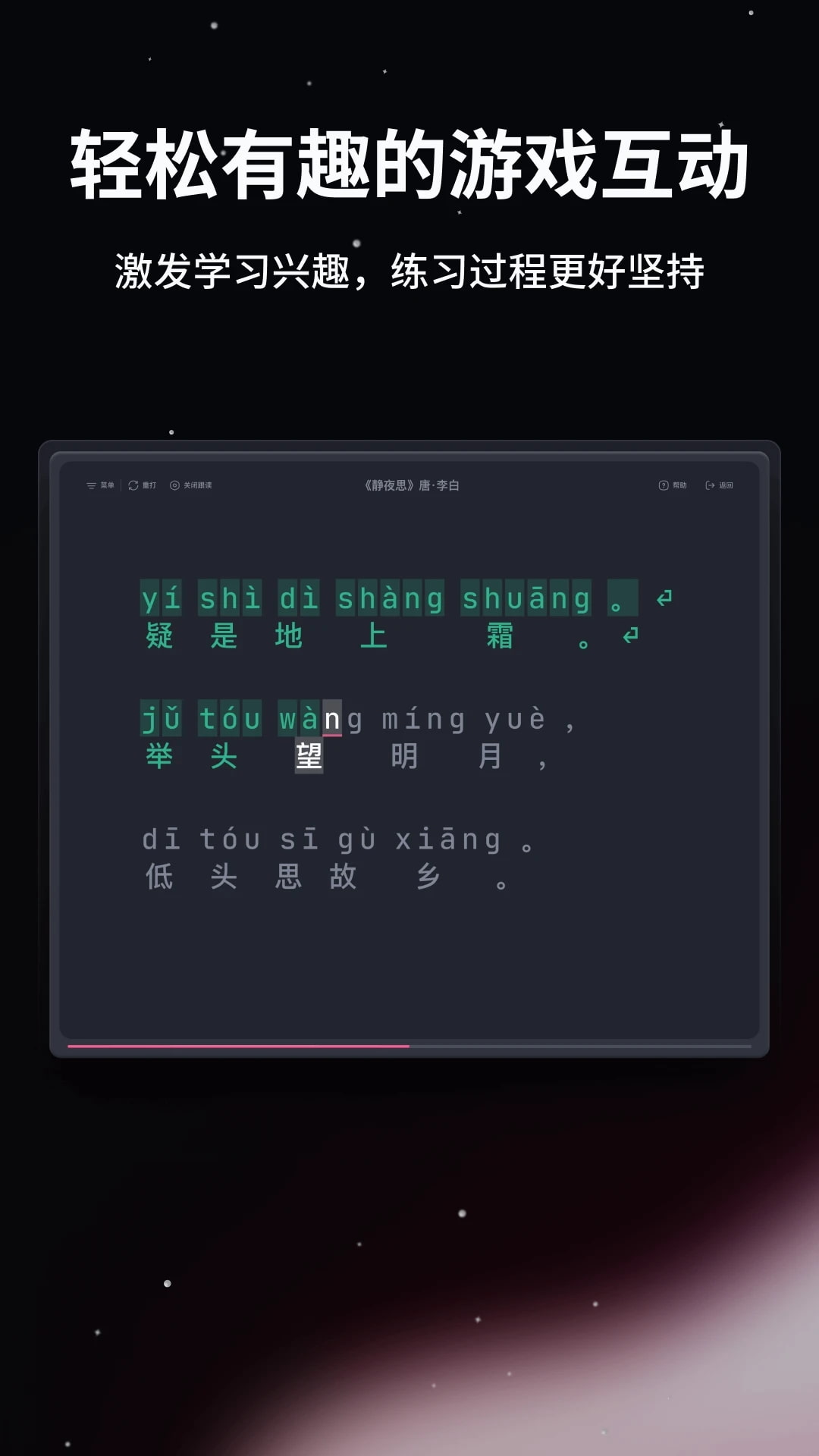 - 趣味打字游戲寓教于樂,激發(fā)學(xué)習(xí)興趣,練習(xí)過程更好堅(jiān)持。