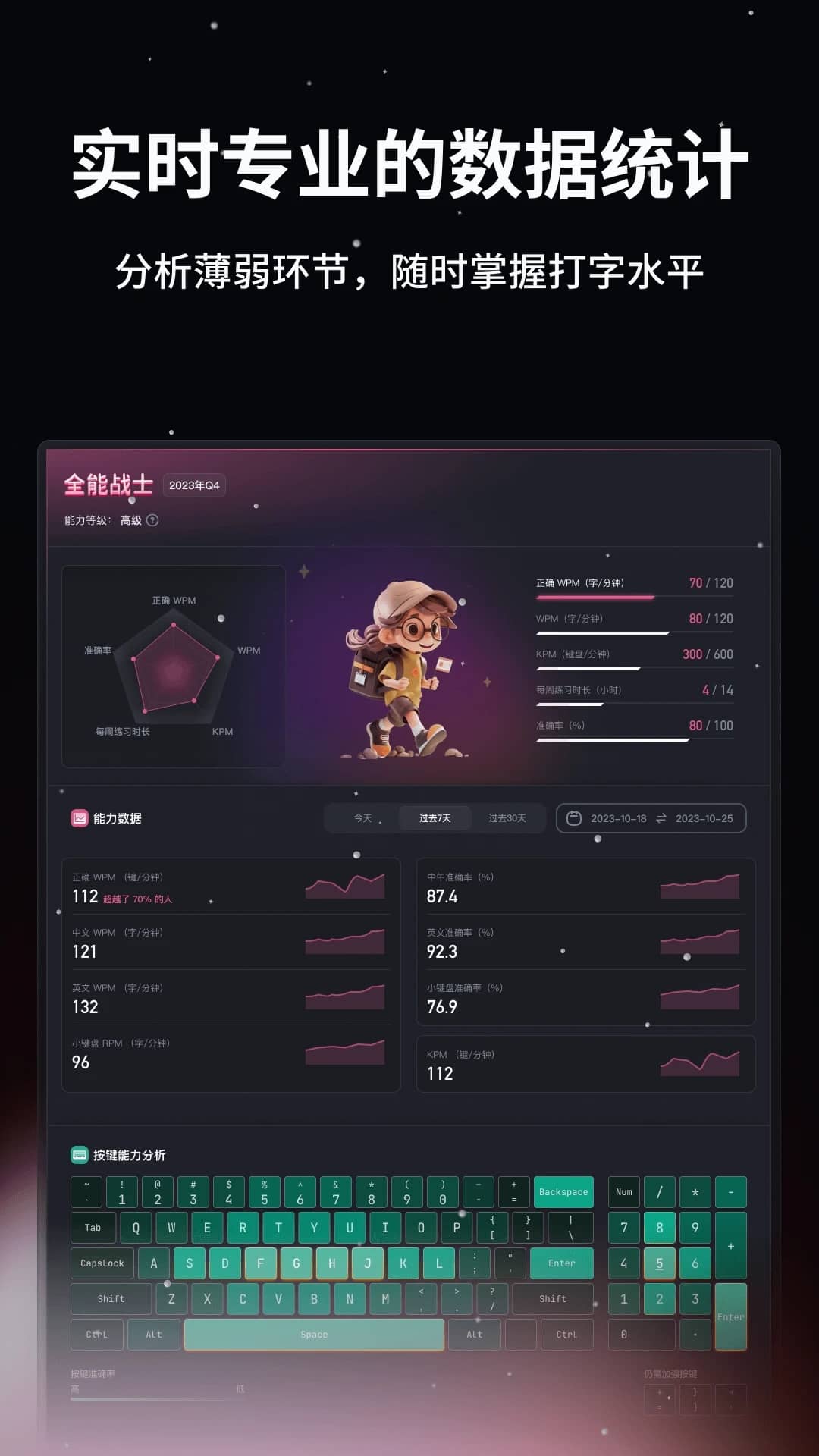 - 提供專業(yè)的評級標(biāo)準(zhǔn)和全面的能力數(shù)據(jù),分析薄弱環(huán)節(jié),隨時(shí)了解打字水平。